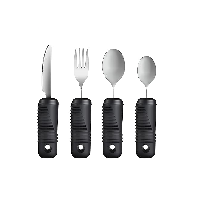 Hnífapör sem bæta stjórn og draga úr handskjálfta. Hentar vel fólki með veikt grip, liðagigt eða skjálfta í höndum. Úr ryðfríu stáli, slitsterkt og auðvelt í þrifum.